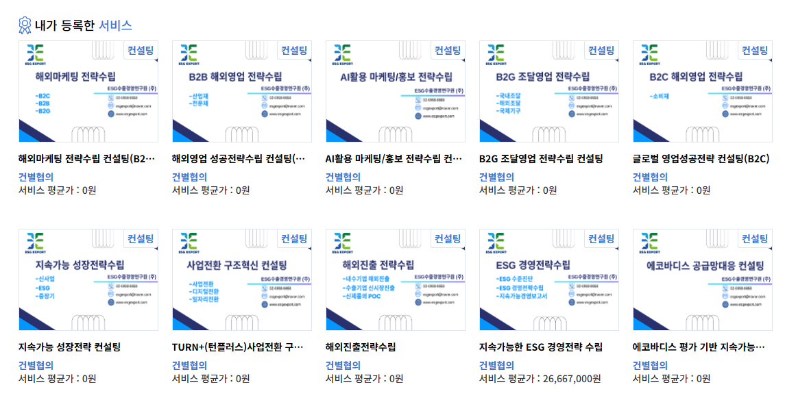 공급기업 리스트-> 서비스 및 공급기업 검색-> "이에스지수출경영연구원(주)"을 검색하시면 제공서비스 목록이 검색됩니다.