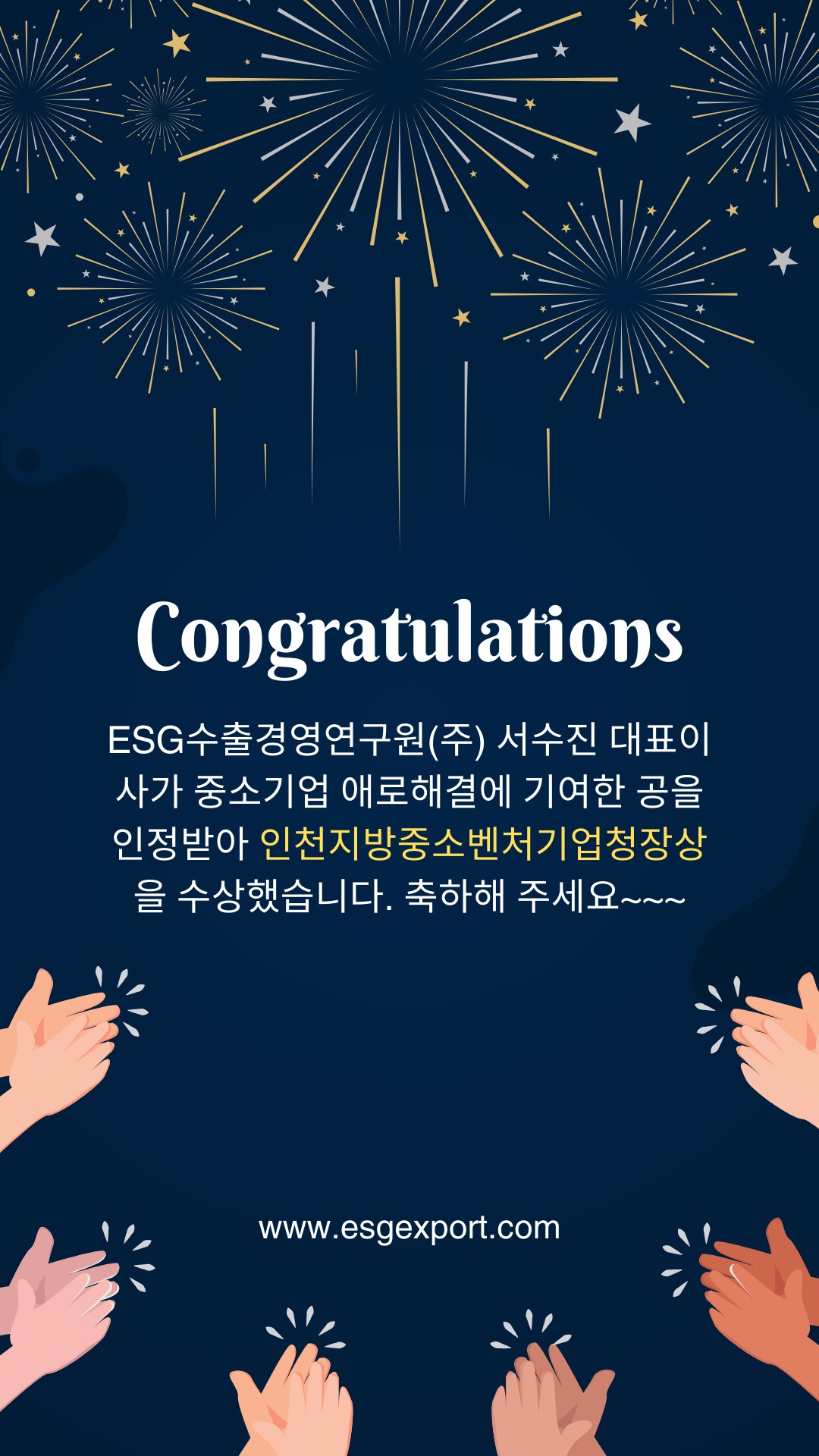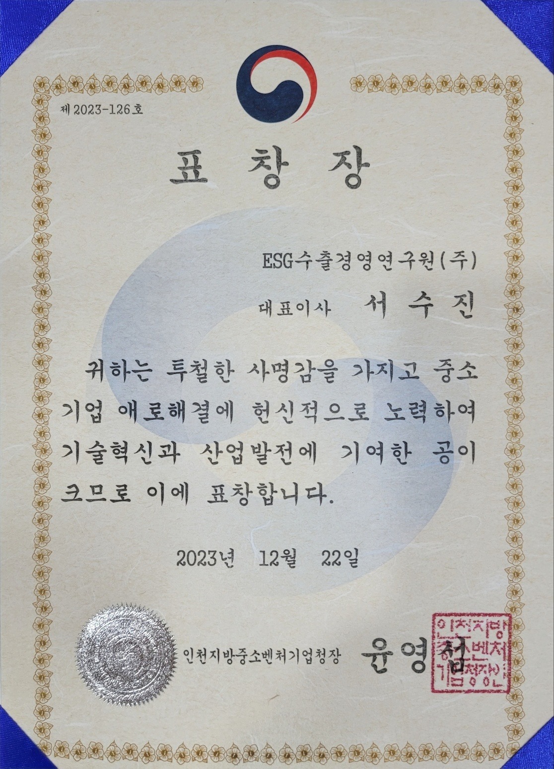 ESG수출경영연구원(주) 서수진 대표이사가 2023년 12월 22일 중소기업 애로해결에 기여한 공로를 인정받아 인천지방중소벤처기업청장상을 수상했다.
